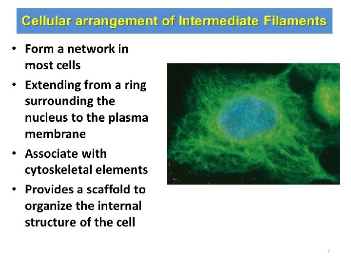 Intermediate filaments are about 8 -12 nm wide; they are called intermediate because they are in-between the size of microfilament sand microtubules. Intermediate filaments are made of different proteins such as keratin. Intermediate filaments have many functions: 1. The intermediate filaments in the cytoplasm maintain the cell’s shape. 2. It bear tension. 3. and provide structural support to the cell. ü