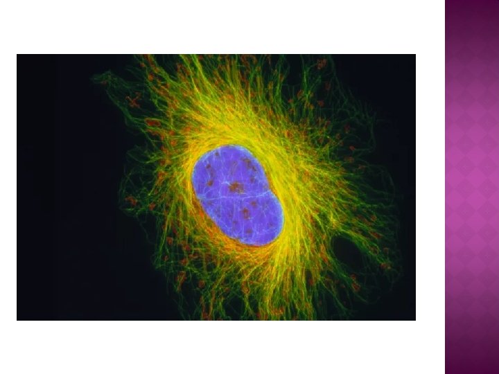 Ø The eukaryotic cytoskeleton consists of three types of filaments, which are elongated chains of proteins: microfilaments, intermediate filaments, and microtubules Ø The microfilaments of this cell are shown in red, while microtubules are shown in green. The blue dots are nuclei.