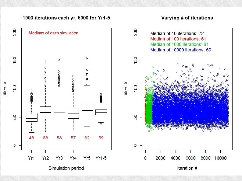 Statistical Experiments Generate a log-normally distributed dataset of 1825 observations corresponding to five years of daily observations Define operating modes (emission rates and number of days per year) Sample the distribution (without replacement) according to the defined modes, compute 98 th percentile, and repeat Determine effect on computed 98 th percentile of varying number of samples drawn