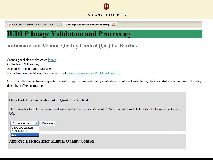 Image QC/upload application 1. User scans scores and uploads to IN Harmony server 2. User accesses Perl-based web application to initiate automated quality control 3. A second user proceeds with manual QC, then uses web application to signal that manual QC is finished 4. The application moves and backs up the files, creates derivatives, and alerts both Fedora and the internal database that the process is complete IN Harmony – DLP Spring Forum 2008 April 28, 2008