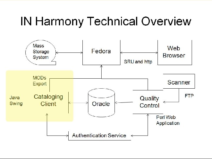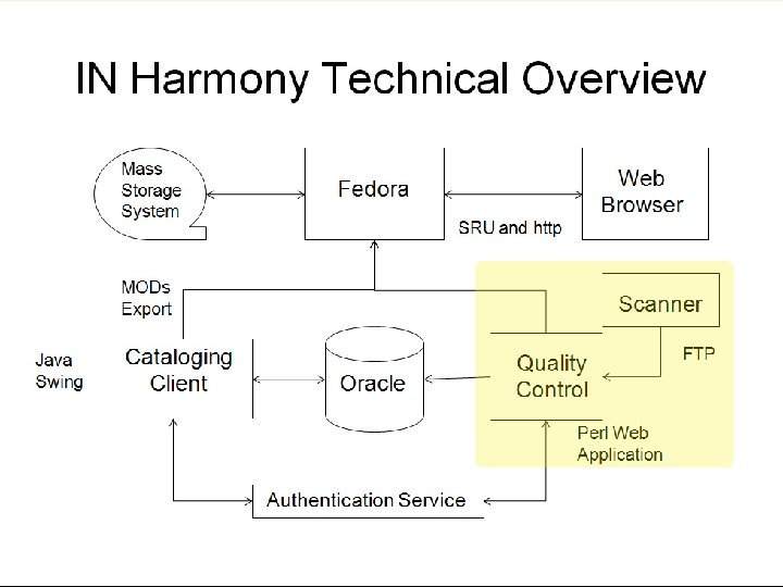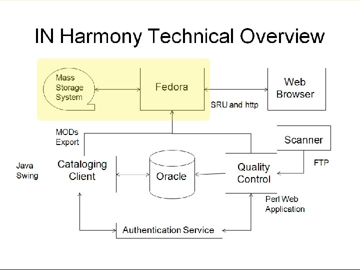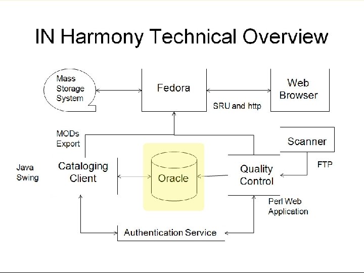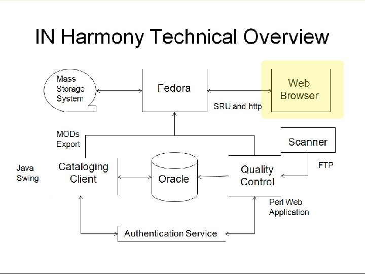 IN Harmony Technical Overview Mass Storage System Web Browser Fedora SRU and http MODs Export Java Swing Cataloging Client Scanner Oracle Quality Control Perl Web Application Authentication Service FTP