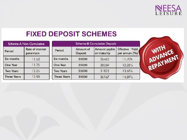 WHY NEESA FD SCHEME ? Highest returns in this instrument type As per the guideline in Companies Act, 12. 5% p. a. is the highest interest on FD a company can give to its Depositors Flexible investment tenure Investors have the option of choosing deposit period ranging from 6 months to 3 years Low risk As issue of all company FD’s is regulated by Companies Act, 1956 and have cap based on company’s Net worth High liquidity All deposits will have lock-in period of 6 months and premature withdrawal after that will attract penalty of just 1% reduction in assured returns