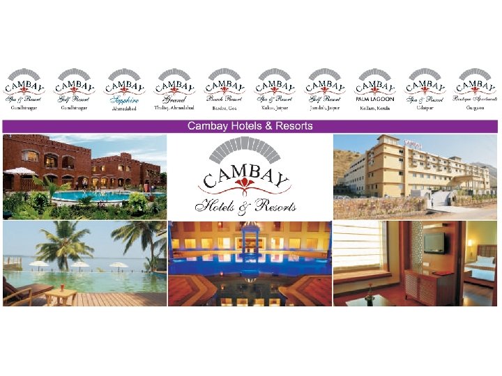 Existing Properties Property Location Category Year of Operation Cambay Spa Resort GIDC – Gandhinagar 5 Star 2005 Cambay Golf Resort GIDC – Gandhinagar 5 Star 2005 Cambay Grand Thaltej – Ahmedabad 5 Star 2009 Cambay Spa & Resort Kukas – Jaipur 5 Star 2008 Cambay Golf Resort Jamdoli – Jaipur 5 Star 2009 Cambay Sapphire Vejalpur – Ahmedabad 3 Star 2007 Cambay Palm Lagoon Astamudi – Kollam - 2008 Cambay Spa & Resort Kaladwas – Udaipur 5 Star 2009 Cambay Beach Resort Calangute – Goa - 2009 Cambay Sapphire - CRN Bengaluru 3 Star 2010