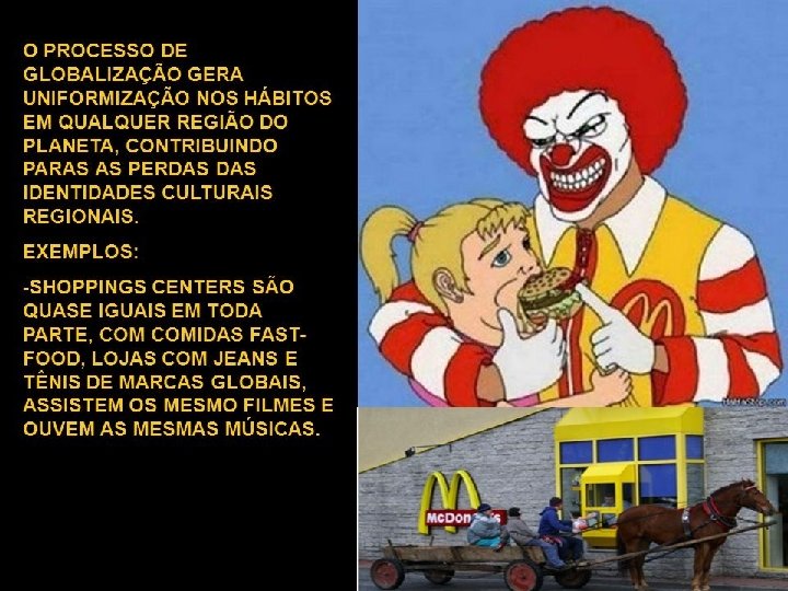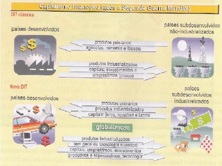 Globalização • Muitas empresas neste momento migram para o sudeste asiático, onde o Estado não dava muitos direitos aos trabalhadores. • Trabalhador muito protegido e como muitos direitos gera crise no capitalismo. • Mercadorias de Industrias europeias e estadunidenses sendo produzidas nos Tigres Asiáticos e depois voltando para seus países de origem para serem consumidas. • Até então ( Déc 70 e 80) ainda existia a União Soviética para fazer frente ao capitalismo. Mas a URSS já vinha apresentando sinais de fraqueza e inicio de uma grande crise, da qual o capitalismo estava se superando adotando o novo formato, o da globalização.
