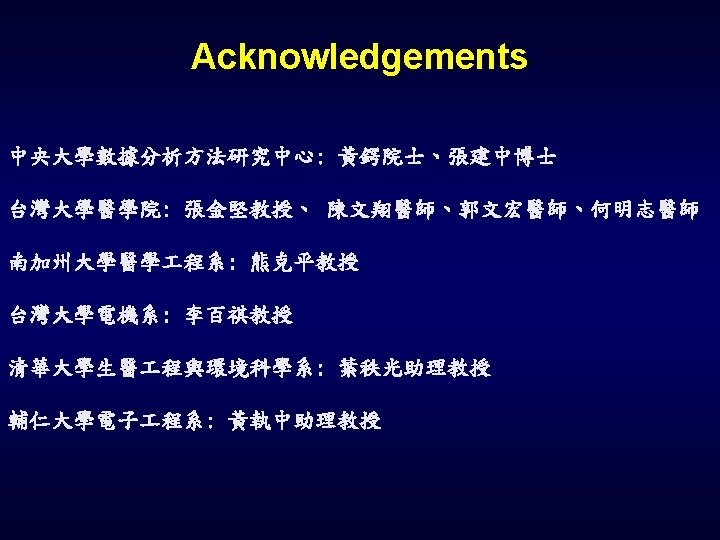 Breast tumors üPatients come from Taiwan University Hospital üIn vivo scan by Terason 2000 Nakagami image Pathology Malignant Benign Total 0. 64 31 (TP) 9 (FP) 40 0. 64 4 (FN) 26 (TN) 30 Total 35 35 70 5 mm At threshold = 0. 64, Sensitivity: 88. 6% Specificity: 74. 3% Accuracy: 81. 4% Fibroadenomas Invasive ductal carcinoma