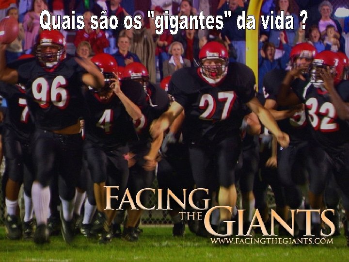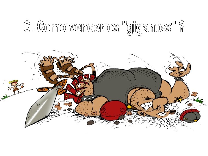 A. Os “gigantes” aparentes 1. Tudo aquilo que nos escraviza. 9 – “. . . vocês serão nossos escravos e nos servirão 2. Tudo aquilo que nos amedronta v. 11 – “. . . ficaram atônitos e apavorados. . . ” v. 24 – “. . . todos fugiram cheios de medo. . . ” v. 42 – “Olhou para Davi com desprezo. . . ” v. 10 – “. . . Eu desafio hoje. . . ” (NVI) v. 10 – “. . . Hoje afronto as tropas de Israel. . . ” (RA)