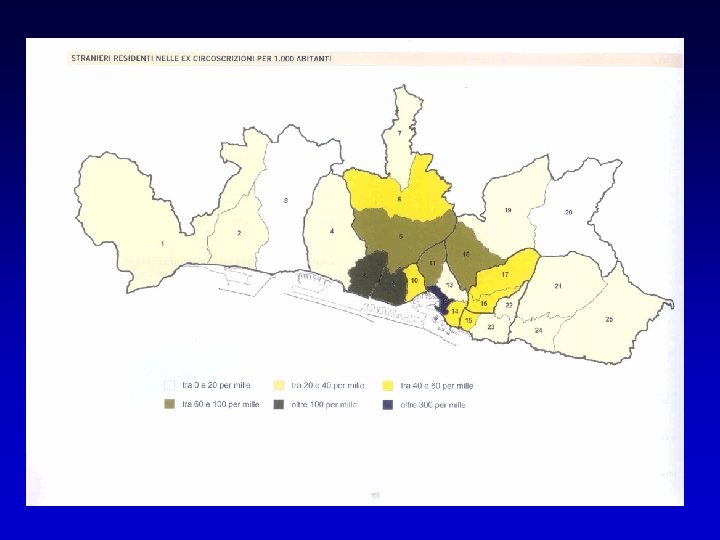 • Nel Centro Storico la percentuale degli stranieri residenti sul complesso degli immigrati a Genova nel 2000 era pari al 25, 7 %. Nel 2006 scende al 13, 8% • In valori assoluti la ex circoscrizione con il maggior numero di stranieri residenti non è più Prè - Molo. Maddalena (4858), ma Sampierdarena(4972)