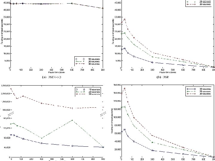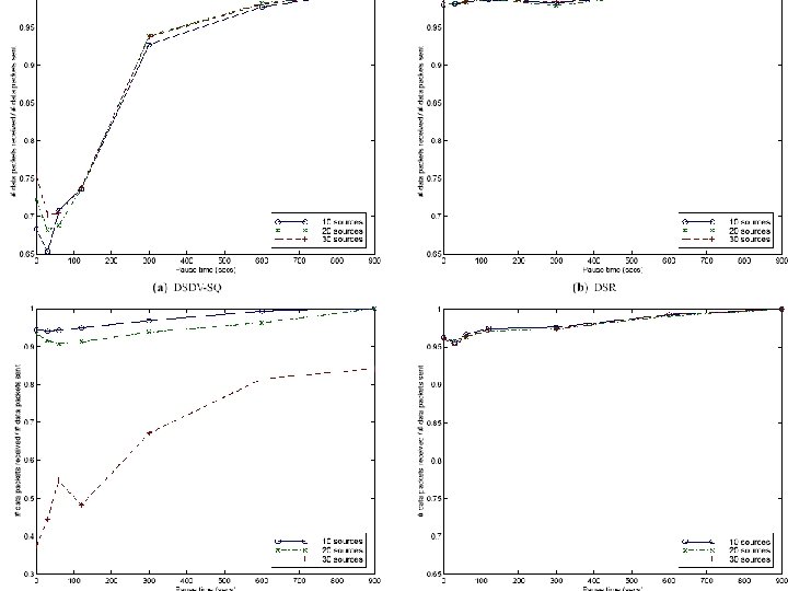 What do we measure? • Packet delivery ratio: Application layer packets originated at source to received packets – Characterizes completeness and correctness of the routing protocol • Routing overhead: Total # of packets sent during transmission – Scalability • Path optimality: Difference between number of hops a packet took and the shortest path measured – Measures the ability to efficiently use network resources.