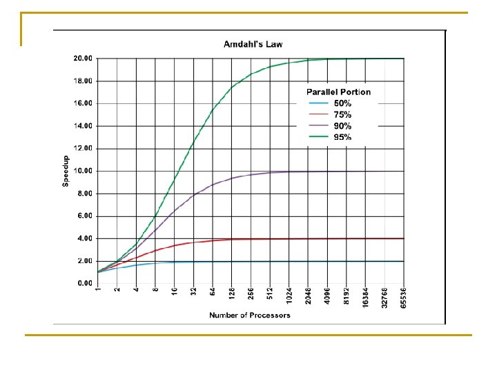 Hatékonyság – Amdahl’s law n n Ha N ∞, akkor speedup 1 / P Ha egy program 50%-a szekvenciális, akkor maximum 2 x-es gyorsulás várható, a processzorok számától függetlenül P : párhuzamosítható műveletek aránya N : processzorok száma