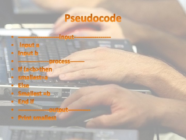 Input Processing Output a b If (a<b) then Smallest=a Else Smallest-b smallest