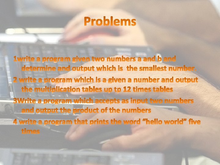 1. 2. 3. 4. Define the problem Propose and evaluate solutions Determine the most efficient solution. Represent the most efficient solution in the form of an algorithm 5. Test and debug the program 6. Document the program (i. e. a written explanation of how the program works and how to use it)