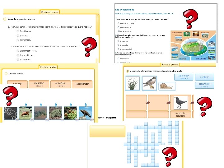 Predadores Animais carnívoros que dan caza a outros animais e se alimentan deles. Preeiros Axudan a eliminar os cadáveres dos ecosistemas. Parásitos Toman o alimento doutros seres vivos, aínda que sen matalos. . Os mosquitos extraen o sangue dos mamíferos.