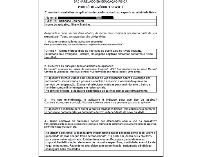 Imagens 2 e 3: Comentário avaliativo de um aplicativo de celular relacionado à atividade física realizado por um dos alunos do curso e postado no AVA da IES.