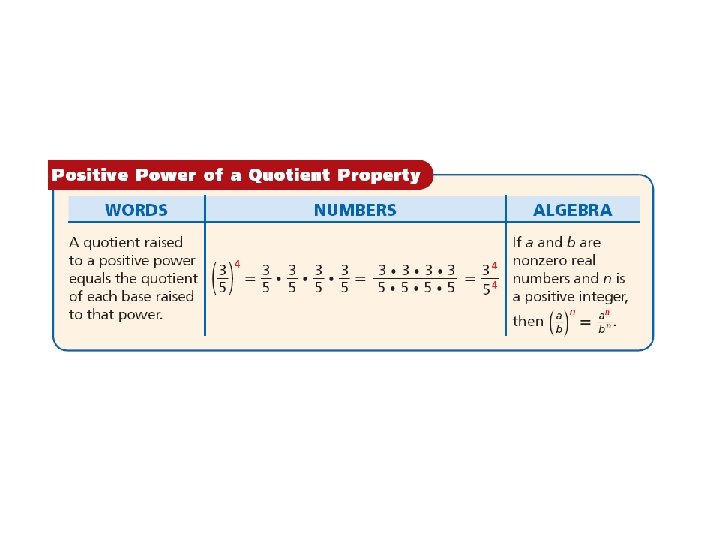 Example 4 C: Finding Positive Powers of Quotient Simplify. Use the Power of a Product Property:
