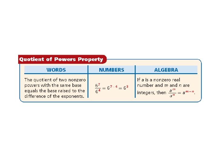 A quotient of powers with the same base can be found by writing the powers in a factored form and dividing out common factors. Notice the relationship between the exponents in the original quotient and the exponent in the final answer: 5 – 3 = 2.