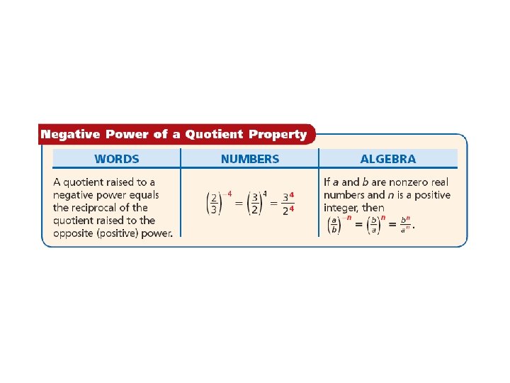 Remember that . What if x is a fraction? Write the fraction as division. Use the Power of a Quotient Property. Multiply by the reciprocal. Simplify. Use the Power of a Quotient Property. Therefore,