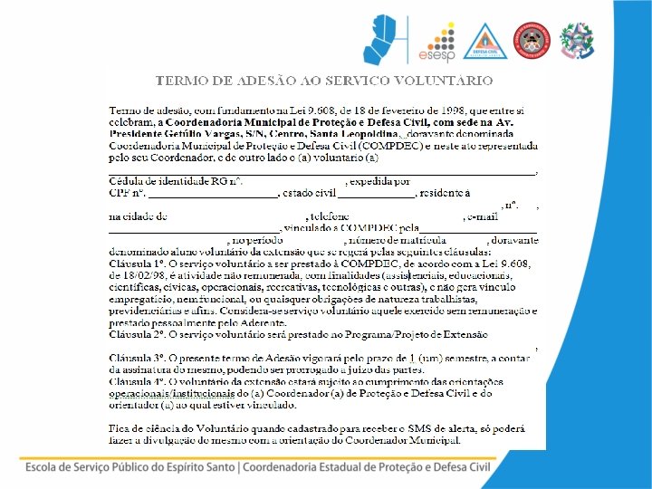 SERVIÇO VOLUNTÁRIO LEGALIDADE • Termo de adesão: • O serviço voluntário será exercido mediante celebração de termo de adesão entre a entidade pública ou privada e o prestador de serviço voluntário, dele devendo constar o objetivo e as condições de seu exercício.