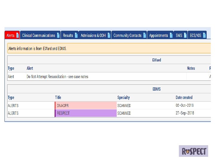 Forth Valley experience • • • Main Pilot Ward Identification at MDT or ward round Sticker as prompt Conversation (initially consultants only) Complete form, scan and email to fv-uhb. respect@nhs. net Communicated in IDL and GP to update Ki. S