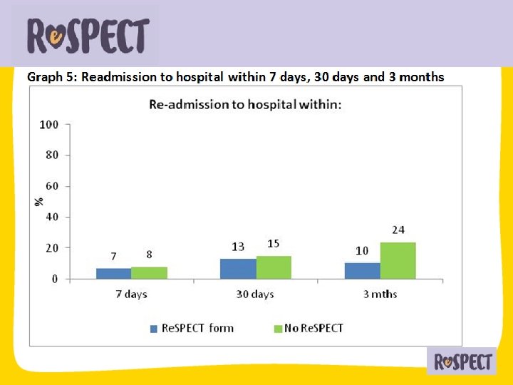 Staff Feedback • 94% felt that Re. SPECT involved the patient and/or family in decision making • 88% felt Re. SPECT would help them deliver the most appropriate care “. . Most have been very receptive…. . some people are not ready to talk about anticipatory care and this is respected” “ Helps me to know how far to escalate the person’s treatment” “It is gentler than DNACPR where the focus is on NOT doing something rather than what we can do with Re. SPECT”