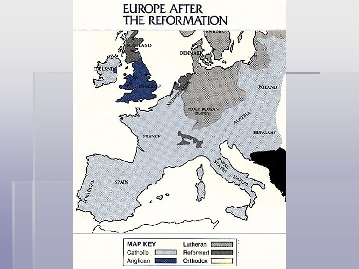 Kálvini reformáció § Kálvin János francia születésű, Genf prédikárora lett § Egyszerű és szegény egyházat hozott létre- semmilyen képet nem tűrt meg a templomban § Predesztináció (eleve elrendelés) § Elvetette a hierarchiát» presbiterek és prédikátorok együtt igazgattak § A kálvinizmus (református hit) elterjedt: Svájc, Franciaország, Németalföld, Skócia, Magyarország