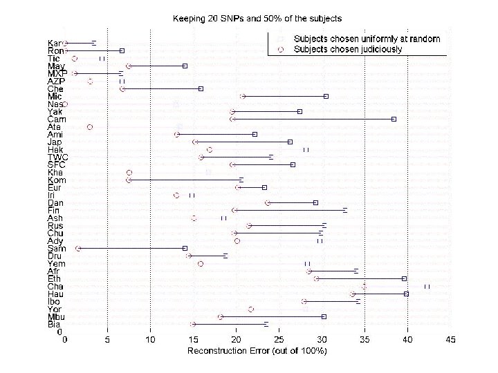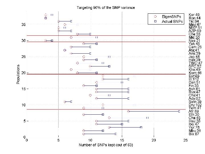 Evaluating (linear) structure For each population We ran SVD to determine the “optimal” number k of eigen. SNPs covering 90% of the variance. If we pick the top k left singular vectors we can express every column (i. e, SNP) of A as a linear combination of the left singular vectors loosing 10% of the data. We ran CUR to pick a small number (e. g. , k+2) of columns of A and express every column (i. e. , SNP) of A as a linear combination of the picked columns, loosing 10% of the data. SNPs individuals 0 0 0 1 0 -1 1 0 0 0 1 -1 -1 0 0 0 1 1 -1 -1 0 0 0 1 0 0 0 -1 -1 -1 1 1 1 -1 1 0 0 0 1 -1 -1 1 1 -1 -1 -1 1 -1 -1 1 -1 1 0 0 1 -1 -1 1 0 0 1 1 -1 -1 0 0 0 1 0 0 0 -1 -1 -1 1 1 1 -1 1 0 0 0 1 1 -1 1 0 1 -1 -1 0 0 0 0 -1 -1 -1 1 1 1 -1 -1 -1 1 0 1 -1 -1 0 -1 1 1 0 0 1 1 1 -1 -1 -1 1 0 0 0 0 0 1 -1 -1 -1 1 0 0 0 1 0 1 -1 -1 0 1 1 1 -1 -1 0 0 0 1 -1 -1 -1 1 -1 1 0 0 0 1 -1 -1 1 0 0 0 1 1 1 0 1 -1 -1 1 -1 -1 -1 0 -1 -1 1