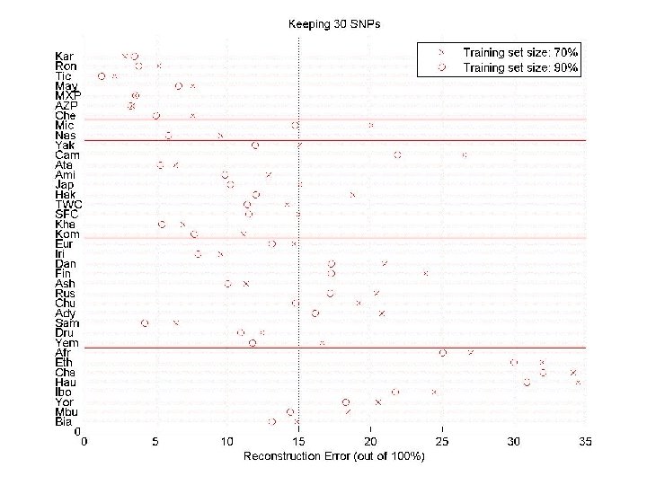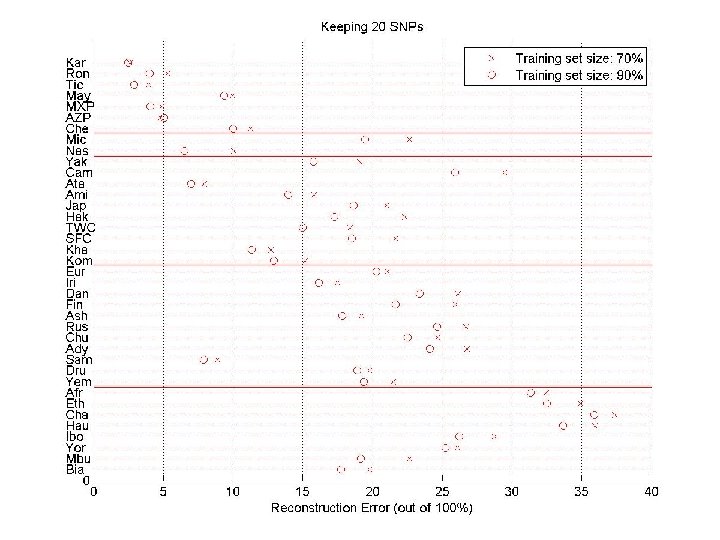 N > 50 N: 25 ~ 50 Finns Kom Zyrian Yakut Khanty Irish European, Mixed Danes Chuvash Russians African Americans Jews, Ashkenazi Adygei Druze Samaritans Pima, Arizona Cheyenne Chinese, Hakka Japanese Han Cambodians Jews, Yemenite Ibo Pima, Mexico Maya Atayal Hausa Yoruba Chinese, Taiwan Ami Biaka Jews, Ethiopian Mbuti Ticuna Micronesians Chagga Nasioi Surui Karitiana Africa Europe NW Siberia NE Siberia SW Asia E Asia N America S America Oceania