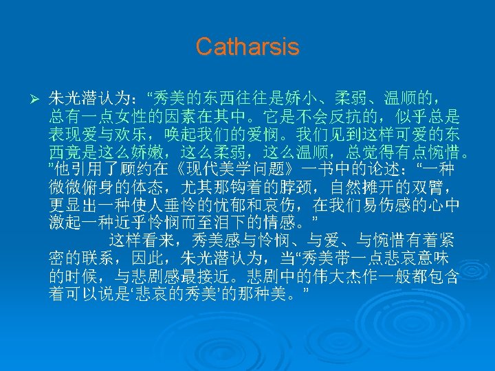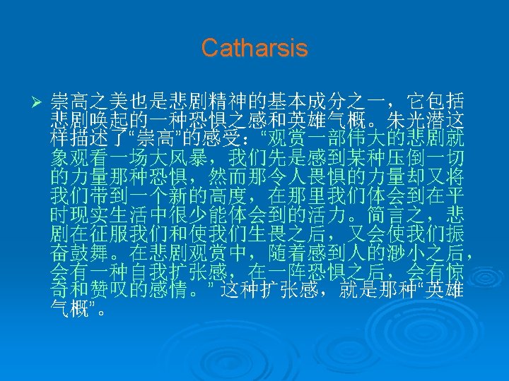 Catharsis Ø Aristotle has defined tragedy as the representation of a complete serious action through artistic language and dramatic representation which by means of pity and fear will bring about the purgation of such emotions. The original Greek term for "purgation" is catharsis. Catharsis is, then, a theory of the effects of literature on the receiver.