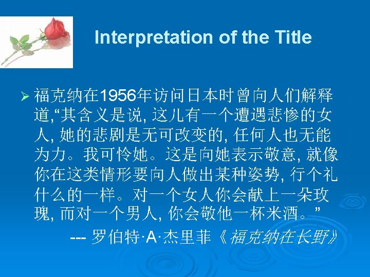The plot and Story in “A Rose for Emily” Plot Sequence: Ø I: the death of Emily died and her funeral; defeating the deputation of aldermen for her taxes; Ø II: the event of smell and the death of Emily’s father; Ø III: Emily’s love with Homer; the purchase of arsenic; Ø IV: the interference of Emily’s relatives; purchasing the wedding things; the disappearance of Homer; Emily gave lessons in china-painting; Ø V: the discovery of corpse.