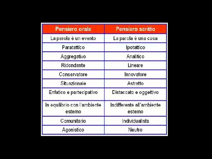 Il passaggio dal parlare alla scrittura è anzitutto un passaggio dal dominio dell’udito a quello della vista • Mentre l’uomo della civiltà orale è completamente immerso in un mondo di suoni che fluiscono verso di lui da ogni direzione • assai diverso risulta la collocazione nel mondo per l’uomo che ha imparato a scrivere e ad oggettivare l’universo nella materialità visibile del testo scritto.