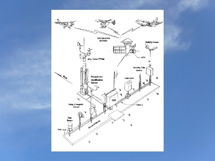 Processing Acquisition Control Unit • Receives data from DCP • Processes, stores and disseminates data • Provides interface with FAA, NWS and/or GTA radio • Data Quality Checks Data Collection Package • Provides power to sensors • Interfaces between ACU and sensors • Collects data from all sensors (except pressure) • Sends data to ACU via RF link