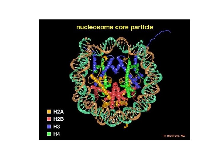 Kromatin alapszerkezet: nukleoszóma § DNS kettős spirál és a hisztonok alkotják § Hisztonok: bázikus fehérjék (arginin és lizingazdag) § 5 osztályuk van: H 1, H 1 H 2 A, H 2 B, H 3 és H 4 nukleoszomális hisztonok Hiszton korong(oktamer): 8 hiszton molekulából álló (2*4) § 2 csavarulatban § 146 bázispárnyi DNS tekeredik rá 2 korong között kb. 60 bp linker régió + H 1 molekula 1 sejtmagban kb. 25 millió nukleoszóma van