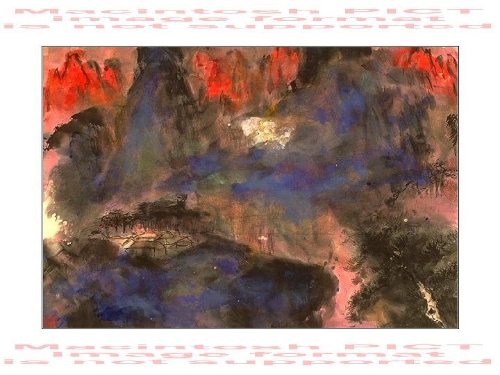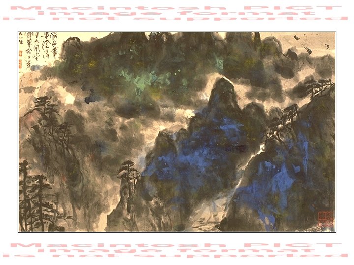 “Blue Mountains” • watercolour, body paint and ink on • • rice paper, 1992. The artist says this painting is a reflection of the feelings the scenery in the Blue Mountains, west of Sydney, inspired in him after he saw the area for the first time. Tie Huang Collection