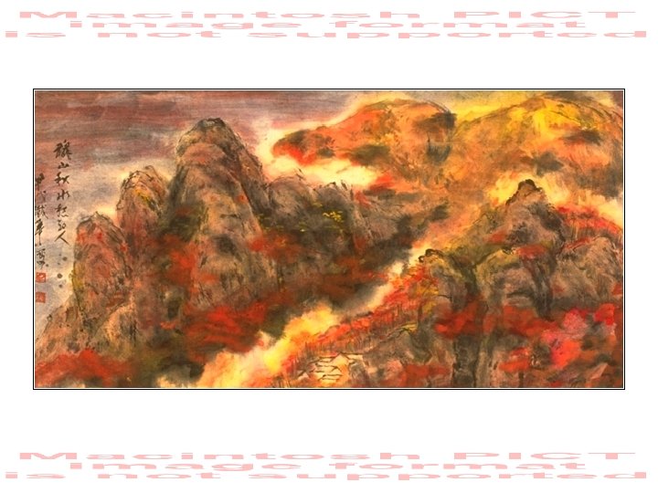 “Mt. Kiera in Black” • watercolour and ink on rice paper, • • • 1996. The inscription tells how the artist started this work, inspired by the style and ideas of one of the most famous of Chinese artists. But through his use of ink and colour, amongst other things, he sought to express his own individuality and at the same time, to find critical approval for his work. With permission of the artist.