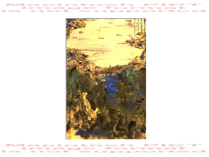 “Georges River” • watercolour, acrylics and ink on • • rice paper, 1996. The inscription on this autumn landscape tells how this season gives one alot to think about. Tie Huang says in China, autumn is always seen as a reflective time, a time when one misses friends and family, when one worries about what the future might hold. And so this view of mountains and water in autumn colours gave him much to think about. Tie Huang Collection.