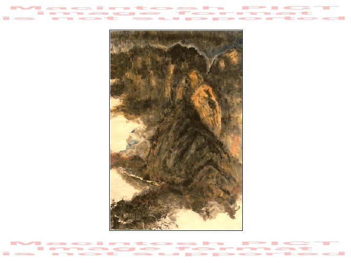 “Mt. Kiera in Black” • watercolour and ink on rice paper, • • • 1996. The inscription tells how the artist started this work, inspired by the style and ideas of one of the most famous of Chinese artists. But through his use of ink and colour, amongst other things, he sought to express his own individuality and at the same time, to find critical approval for his work. With permission of the artist.
