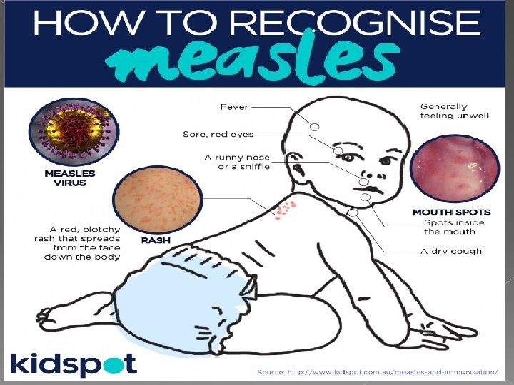 What is measles? It’s a viral infection of respiratory system with distinct red spots followed by a rash on the skin. � It’s a very contagious disease that can spread through with infected mucus and saliva. An infected person can release the infection into the air when they cough or sneeze. � Drinking from an infected person’s glass, or sharing eating utensils with an infected person, increases your risk of infection. �