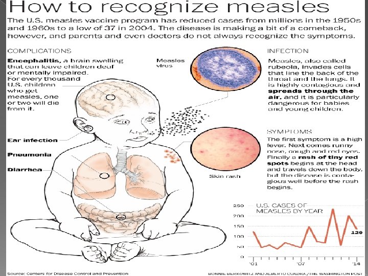 TYPE OF DISEASE Measles is a highly contagious/ infectious viral disease caused by a paramyxovirus. � Its an infection that affects the respiratory system. � It is airborne( through droplets). � There are two types of measles, they are German measles or rubella, which forms rashes on the skin and it lasts about three days and rubeola or regular measles, is the second type that lasts about seven days. Roseola is similar to measles, it forms rashes and comes and goes in 24 -48 hours �