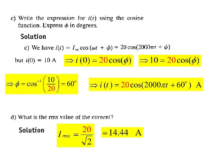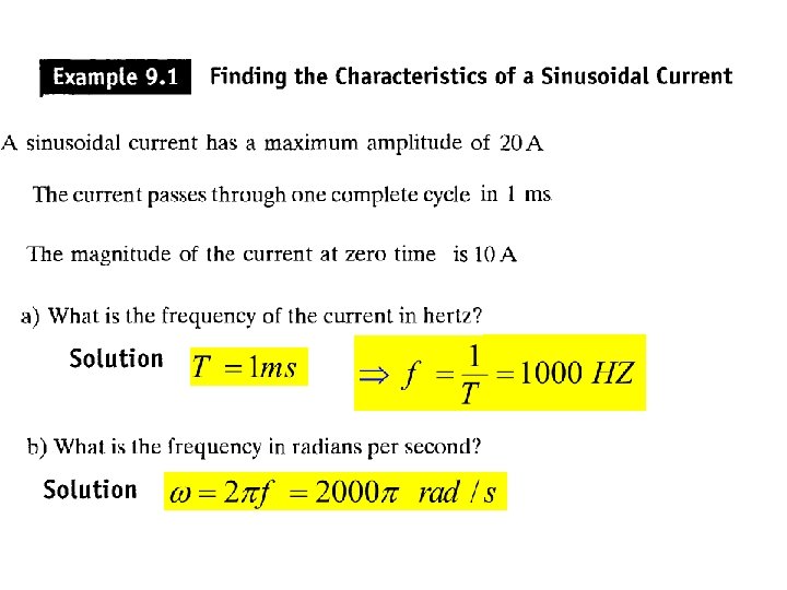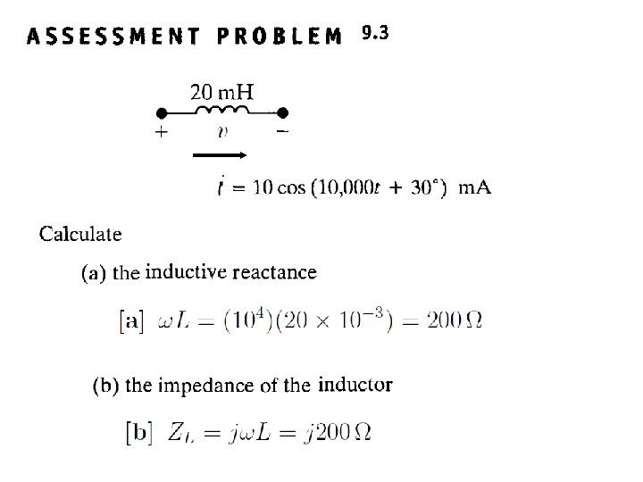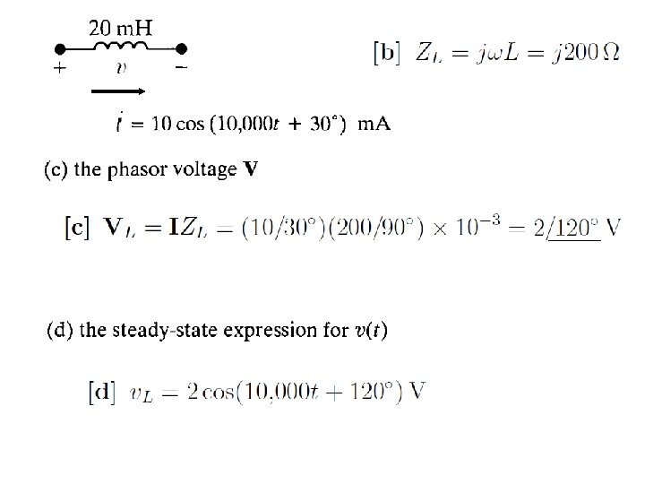 Example 9. 6 for the circuit shown below the source voltage is sinusoidal (a) Construct the frequency-domain (phasor, complex) equivalent circuit ? (b) Calculte the steady state current i(t) ? The source voltage pahsor transformation or equivalent The Impedance of the indictor is The Impedance of the capacitor is