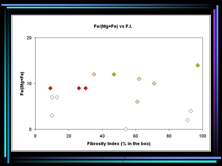 Index of mineral properties • Fibrosity chart procedure is intuitively satisfying – each fiber is plotted • No matter how asbestiform/non-asbestiform, there tend to be at least a few data points outside/inside the 20: 1 box • Good mineral property index – every example seems to be on scale • Let’s define F. I. = % fibers inside the box • What variation in F. I. is normal? examples of actinolite, tremolite and anthophyllite