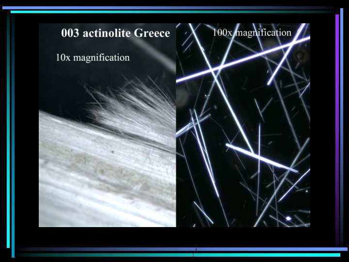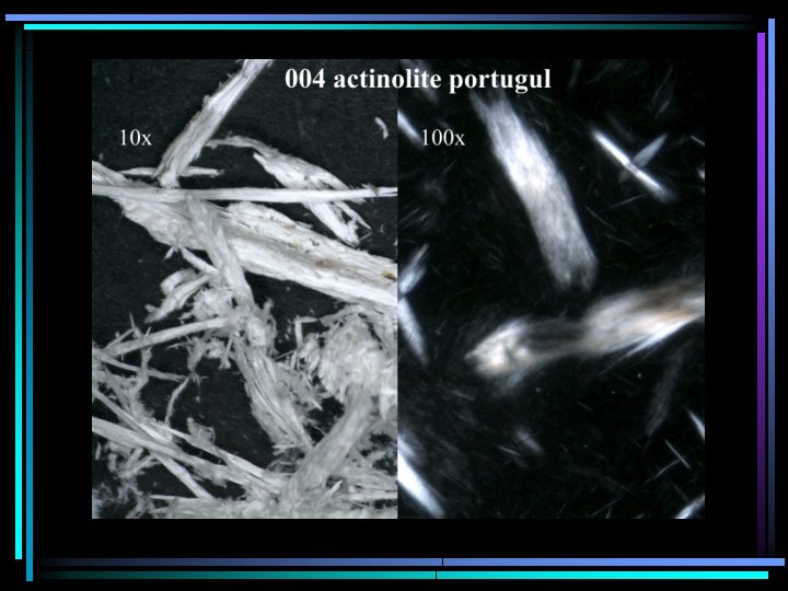 Both are asbestiform actinolite • 1 st is straight at any magnification; shiny clear-white under stereoscope; kind of chunky @100 x though fibrous; not much brooming • 2 nd is flexible; dead-white under stereoscope; can hardly be seen @100 x; lots of brooming
