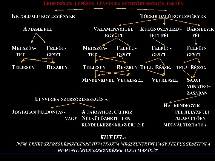 A lényeges szerződésszegés Lényeges szerződésszegés Jogtalan felbontás A szerződés tárgyához és céljához nélkülözhetetlen rendelkezés megsértése a szerződés megszüntetésének, az abból való kilépésnek vagy az alkalmazás felfüggesztésének az indoka Nem lehet hivatkozni a szerződésszegésre humanitárius szerződés megszüntetése vagy felfüggesztése céljából