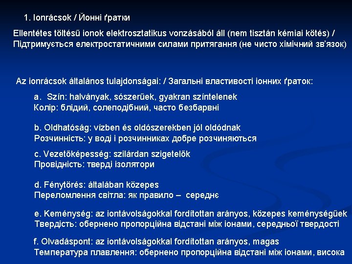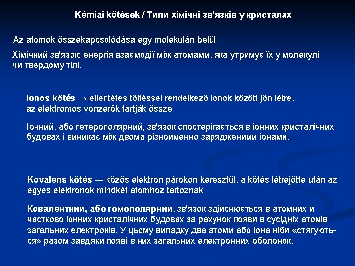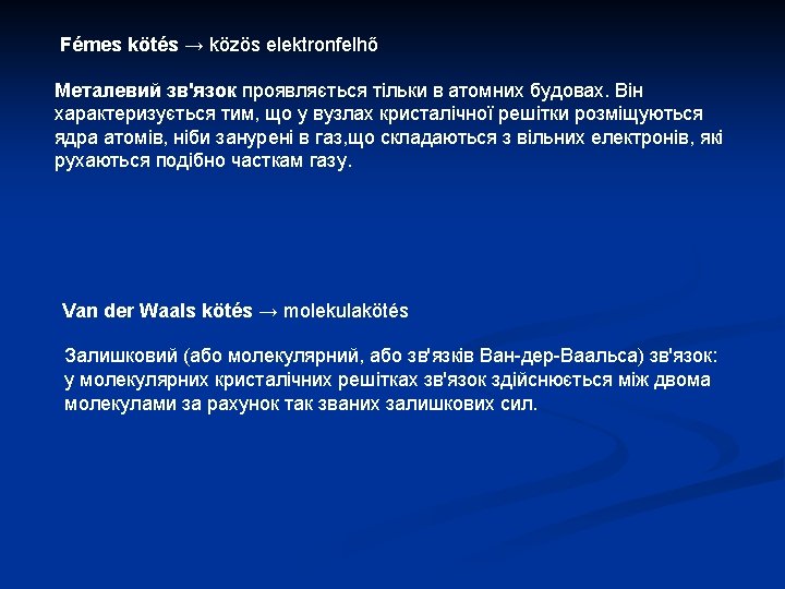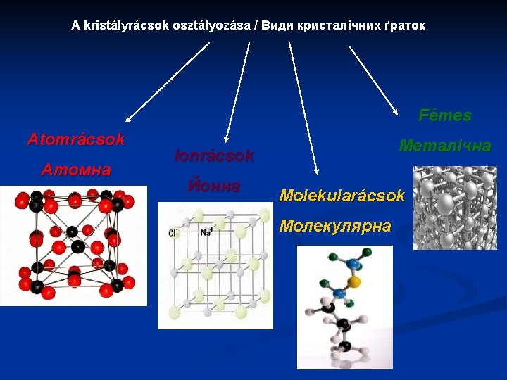 3. Fémes rácsok / металичні гратки A fémionok által leadott elektronok szabadon mozgó elektronfelhőt alkotnak Nincs kitüntetett kötésirány, a kötés gömbszimmetrikus Kitűnő a hő és elektromos vezetőképességük Optikailag vékonycsiszolatban átlátszatlanok (opakok) Mechanikailag igen jól munkálhatók