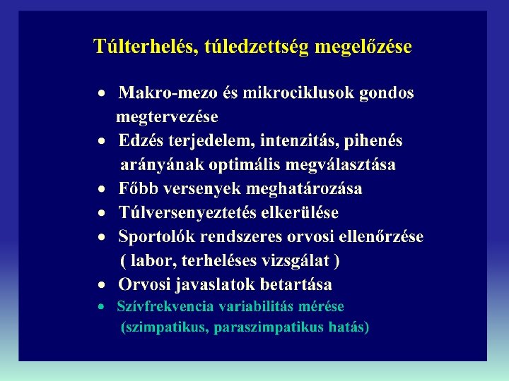 Túlterhelés (overreaching) néhány kritériuma • Kerékpárergométeres többlépcsős terhelés; országúti kerékpárosok (Snyder, 1995) - maximális teljesítmény > 3%-kal csökken - maximális pulzusszám > 5 ütés/perccel csökken - plazma kortizol koncentráció legalább 60 nmol/l-rel csökken. • Futószalag; női állóképességi sportolók (Uusitalo, 2001) - VO 2 max > 4%-kal csökken - maximális sebesség csökken - nem specifikus tünetek is megjelentek (pl. edzésfáradtság, alvásproblémák, rendszertelen menstruáció, étvágytalanság, stb. ). • Szérum karbamid koncentráció (Hartmann, 2000) -férfiaknál > 8, 3 mmol/l -nőknél >7, 0 mmol/l