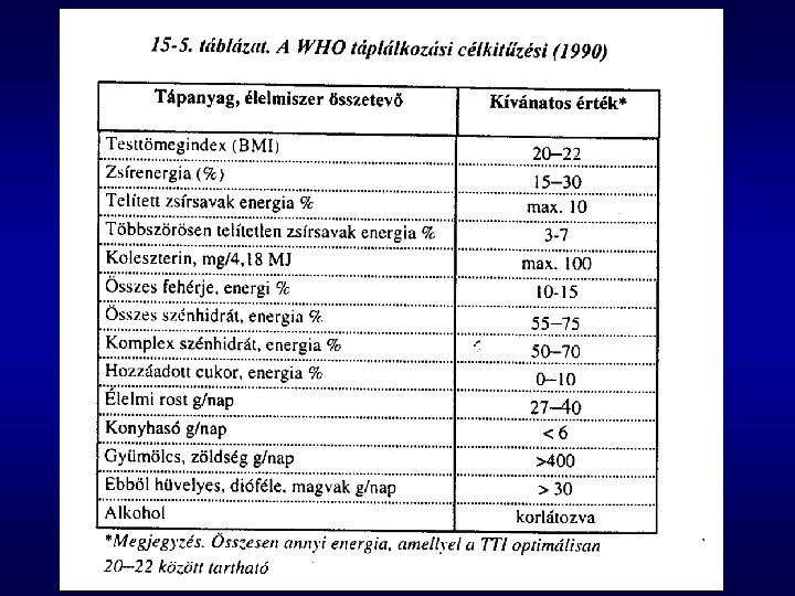 Hazai táplálkozási ajánlások • étrendünket minél változatosabban, többféle élelmiszerből, különböző ételkészítési eljárások felhasználásával állítsuk össze • kerüljük a zsíros ételeket, csökkentsük az állati zsírok felhasználási arányát • sütéshez használjunk olajat • preferáljuk a zsír- és olajmentes ételkészítési eljárásokat (grillezés, párolás stb. ) • csökkentsük a só felhasználást • édességet csak az étkezésekhez kötődően fogyasszunk, kerüljük a gyakori nassolást • helyezzük előtérbe a természetes gyümölcs és zöldségleveket a cukrozott üdítőitalokkal szemben • rendszeresen fogyasszunk tejet és tejterméket • naponta fogyasszunk nyers gyümölcsöt, zöldségfélét, salátákat • a teljes kiőrlésű kenyerek, köretként a burgonya és a párolt zöldségek fogyasztása javasolt • lehetőleg naponta többször, négyszer-ötször étkezzünk, azonos időpontokban • az étkezésre szenteljünk elég időt, teremtsünk nyugodt körülményeket • fogyasszunk több ivóvizet, kevesebb tömény alkoholt