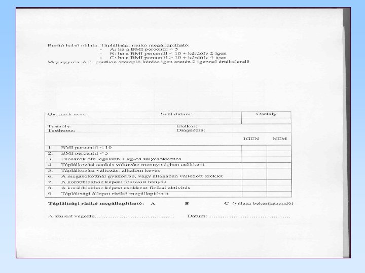 Tápláltsági rizikó-állapot szűrés egyszerű reprodukálható sensitív specifikus néhány adat BMI percentil súly/hossz – percentil táplálkozási előzmény