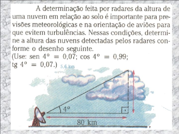 EXEMPLO EXPICATIVO Dados ngulo= 37 Hipotenusa= 10 Cat. Oposto= h Cat. Adjcente = --- Que fórmula devo usar? Seno Sen 37= C. op Hip 0, 601 = h 10 h = 10 x 0, 601 h = 6, 01 m