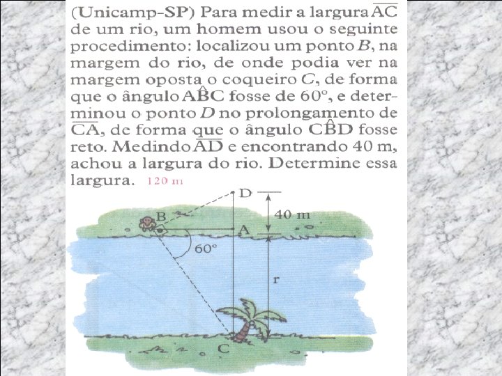 EXEMPLO EXPICATIVO O ângulo de elevação do pé de uma árvore, a 50 m da base de uma encosta, ao topo da encosta é de 60º. Que medida deve ter um cabo para ligar o pé da árvore ao topo da encosta? Dados ngulo= 60 Hipotenusa= x Cat. Oposto= Cat. Adjcente = 50 Que fórmula devo usar? C. adj Cos 60= cos 0, 5 = Hip 50 x x = 50/ 0, 5 x= 100 m