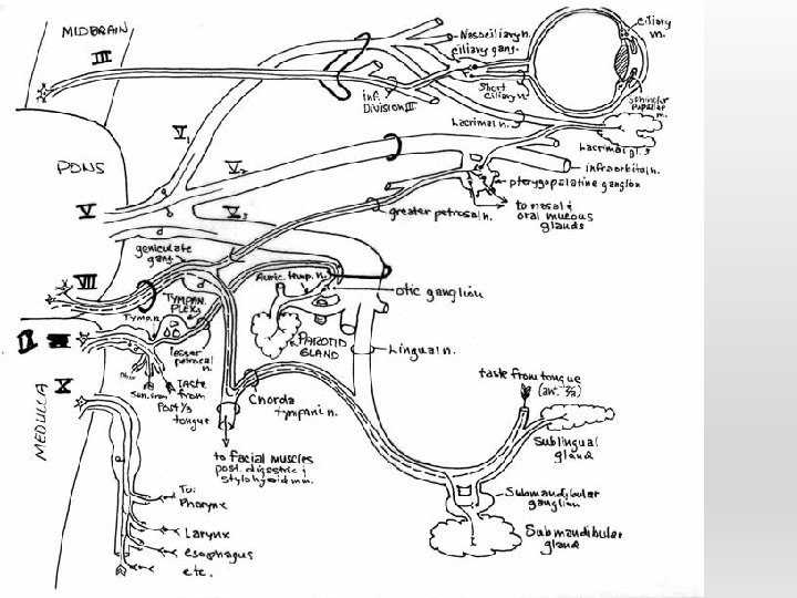 Cranialis Parasympathicus Nucleus Preganglionaris Ganglion Postganglionaris Célszerv Nucl. accessorius n. oculomotorii (Edinger -Westphal) N. oculomotorius (III) Ggl ciliare Nn ciliares breves M ciliaris M sphincter pupillae N. petrosus major Ggl pterygopalatinum N zygomaticus Rr orbitales Rr nasales Nn palatini (N maxillaris + N ophthalmicus) Gl lacrimalis szájpad, orrüreg mirigyei Chorda tympani Ggl submandibulare Rr glandulares (N lingualis) Gl submandibularis, Gl sublingualis N. petrosus minor Ggl oticum N auriculotemporalis Gl parotidea Nucl. salivatorius superior Nucl. salivatorius inferior