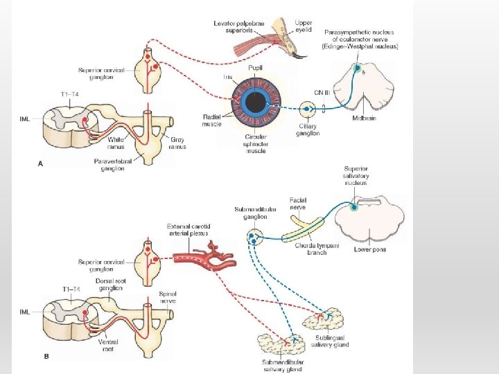 szimpatikus hatások: α és β noradrenerg receptorok: α: a bőr és a belső szervek erei (kontrakció), m. dilatator pupillae (pupillatágulat) β: szívizom (szívfrekvencia emelkedése), bronchiolus simaizom, bél simaizom (relaxáció) verejtékmirigyek: kolinerg receptorok paraszimpatikus hatások: kolinerg receptorok: pupillaszűkület, bronchiolus kontrakció, bélizomzat kontrakció (perisztaltika fokozódása), szívfrekvencia csökkenése (α és β receptor agonisták and antagonisták, acetilkolin agonisták and antagonisták - asthma bronchiale, magas