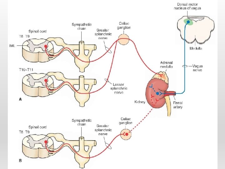 perifériás vegetatív idegrendszer felépítése: • preganglionáris rost • vegetatív ganglion (szinapszis) • postganglionáris rost kivéve a mellékvese velőállományt (csak preganglionáris rostot kap) neurotranszmitterek a vegetatív idegrendszerben: ganglionok, paraszimpatikus neuronok: acetilkolin szimpatikus neuronok: noradrenalin (kiv. verejtékmirigy: